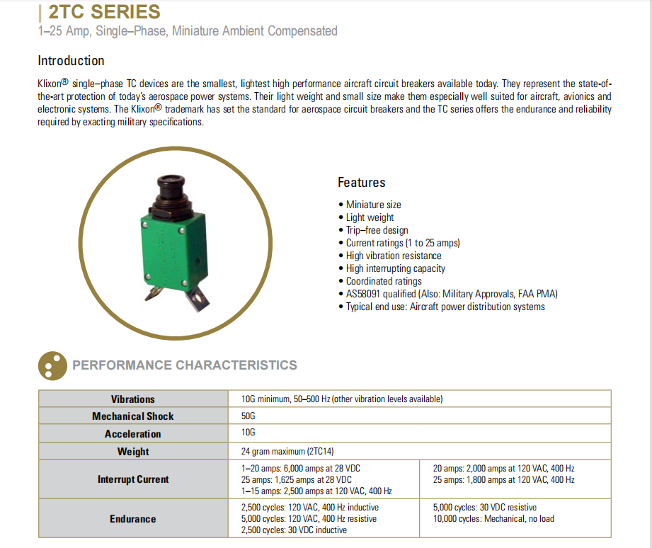Klixon单相TC设备是当今可用的最小、最轻的高性能飞机断路器.它们代表着当今航空航天动力系统的最先进保护。它们重量轻,体积小,特别适合飞机、航空电子和电子系统。Klixon商标为航空航天断路器设定了标准,TC系列提供了严格的军事规格所要求的耐久性和可靠性。